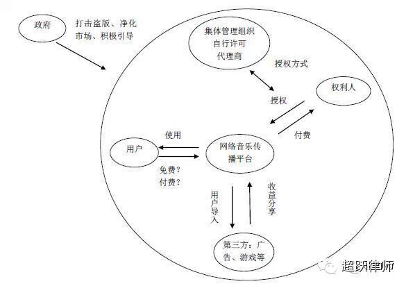在目前的网络音乐模式中,网络音乐平台成为联系权利人、网络用户、第三方的桥梁。首先,音乐平台作为传播者,通过向权利人付费而从权利人处获得授权;其次,音乐传播平台将其获得授权的音乐提供个网络用户使用,目前的普遍做法是网络音乐平台免费为用户提供音乐,虽然有以腾讯为表的“增值服务”付费模式,但其基础仍是免费模式;再次,网络音乐平台为支撑其免费模式,与第三方合作,通过向广告商、游戏商等第三方导入用户而参与收益分享。权利人的收益主要是从网络音乐平台的付费获得。这一模式中,网络音乐平台替代了传统上版权作品“使用者”角色而向权利人付费,对于网络音乐平台而言,其与网络用户之间形成的服务市场基本属于免费模式,而其与权利人之间的市场却是付费模式,网络音乐平台为了维持其自身运营,用从第三方获得的利益分成向权利人付费,从而保证向用户提供免费服务。
