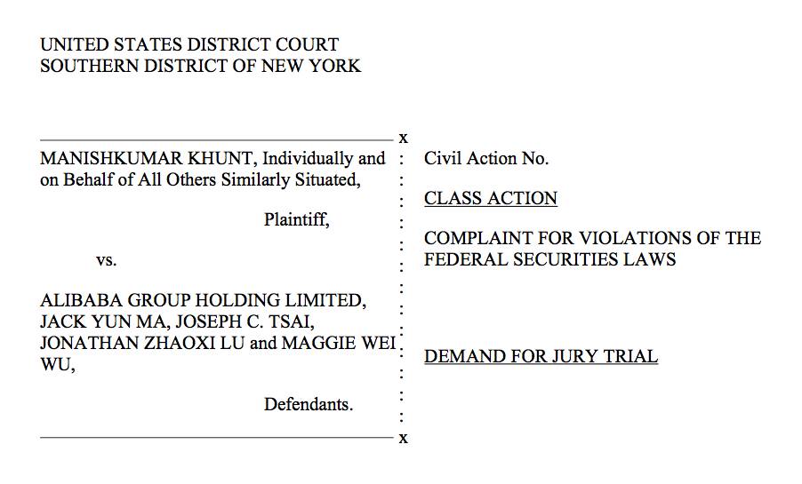 本案为证券集体诉讼,原告Manishkumar Khunt代表其个人,以及其他在2014年10月21日至2015年1月28日期间(即后文所称“集体诉讼期”),购买阿里巴巴公司美国存托股票(Alibaba American Depositary Shares,以下简称“阿里巴巴股票”)的集体诉讼成员,起诉阿里巴巴公司以及公司管理人员、董事等相关人员违反美国1934年证券交易法案(简称“1934年法案”)。基于原告的个体认知、意愿,根据原告律师调查所获得的相关信息,包括美国证券交易委员会对阿里巴巴集团控股有限公司的审查文件(下文称“阿里巴巴”或“阿里公司”)、针对阿里巴巴的相关媒体报道、阿里公司自身发布的新闻等资料,原告提出了以下诉讼主张。原告相信,随着诉讼程序的推进,经过合理的证据开示程序,将出现更多的证据支持原告的主张。